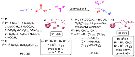 Catalyst 2 (Scheme 2) was also used by the same authors [13] for the synthesis of substituted propargylamines (Scheme 6) [25]. The reaction of all three components (alkyne/aldehyde/amine: 1.1/1/1.1; 1 mol % Cu) catalysed by catalyst 2 proceeded in toluene (6 h, 110 °C) with yields of isolated propargylamines in the range of 64–95% (Scheme 6). Also in this case, different solvents were tested for the reaction of phenylacetylene, benzaldehyde and piperidine catalysed by catalyst 2: water (trace), methanol (trace), ethanol (trace), THF (22%), MeCN (36%), dimethylformamide (DMF) (48%), dichloroethane (DCE) (46%), DMSO (50%) and toluene (85%). The recovery and reusing of catalyst 2 was studied for the same reaction, again with only slight decrease in yields: Cycle 1: 85%; Cycle 5: 83% (Scheme 6) [25]. Catalyst 11 was prepared by the reaction of commercial chloromethylated polystyrene with N-phenyl piperazine and subsequent complexation with CuBr2 (Scheme 6) [26]. The reaction of all three components (alkyne/ketone/amine: 1/1/1; 0.7 mol % Cu) catalysed by 11 was performed under solvent free conditions (6 h, 110 °C) with the yields of isolated propargylamines in the range of 88–95%. The recovery and reusing of catalyst 11 was tested for the reaction of phenylacetylene, cyclohexanone and piperidine, while only negligible decrease in yields was also observed: Cycle 1: 94%; Cycle 5: 92% (Scheme 6) [26].