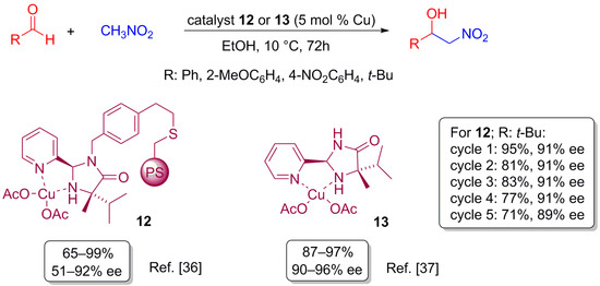The nitroaldolization (Henry) reaction catalysed by chiral optically pure catalysts is important among reactions; it involves the formation of a new carbon–carbon bond [32,33,34,35,36,37,38,39]. This reaction occurs in the synthesis of substituted 2-nitroalcohols used e.g., for the preparation of biologically active compounds and medicinal drugs [34]. A recently published comprehensive paper [35] covers works concerning catalysts based on supported transition metal complexes aimed for an asymmetric variant of the Henry reaction. Three recent works were not covered in the above mentioned review [36,38,39]. The first work [39] included a study of a library of substituted polystyrylsulfonyl-imidazoline-aminophenol copper complexes as solid supported catalysts for the Henry reaction. The selected complex of copper(II) acetate, based on (S,S)-diphenylethylenediamine-derived imidazoline, (S)-phenylethylamine, and dibromophenol, was highly efficient and provided the products of the reaction (nitromethane with substituted aldehydes) in high yields (76–99%) and high enantioselectivity (75–95% ee). The same ligand as a complex with copper(II) triflate was examined in the Friedel–Crafts alkylation of indole by substituted nitroalkenes, to give the adducts in high yields (86–99%) and high enantioselectivity—up to 83% ee [39]. The second variant of immobilization represented recyclable the heterogeneous catalyst 12 (Scheme 7), containing imidazolidine-4-one covalently bound on swellable pearl-like polystyrene having an –SH group (200–800 µm) [36]. Covalent anchoring of the ligand was performed by radical thiol-alkene click reaction, initiated thermally (azobisisobutyronitrile (AIBN), toluene, reflux 24 h), as well as photochemically (2,2-dimethoxy-2-phenylacetophenone, λmax = 365 nm, 40 W, DCM, 25 °C, 24 h). For the subsequent reaction of the copolymer with copper(II) acetate, heterogeneous catalyst 12 was prepared, and was characterized by elemental microanalysis and Raman spectroscopy [36]. Henry reactions proceeded in the polymeric matrix of swellable catalyst 12 with a rate comparable with the use of catalyst 13 in homogeneous media [37]. The corresponding substituted (R)-2-nitroethanols were produced in high yields (65–99%) and with high enantioselectivity (up to 92% ee) comparable with the homogeneous catalyst 13 (up to 96% ee). The reuse of catalyst 12 was studied for the reaction of pivalaldehyde with nitromethane. After five-fold recovery and reuse of heterogeneous catalyst 12, a decrease in yield of about 24% occurred; on the other hand, the decrease in enantioselectivity was negligible (3% ee) (Scheme 7) [36].