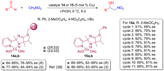 The third variant represented heterogeneous catalysts 14a,b based on Cu(II) complexes of substituted imidazolidine-4-thiones immobilized by means of sulfur atoms on different types of polystyrene carriers (polystyrene-co-4-vinylbenzyl chloride-co-tetra(ethylene glycol)-bis(4-vinylbenzyl)ether), Merrifield resin™ and JandaJel resin™ (Scheme 8) [38]. It was found, that catalysts 14a,b catalyse the Henry reaction with high yields and high enantioselectivity, regardless of the polymeric carrier used (up to 98% ee). The obtained yields and enantioselectivities were comparable with the individual cases of reactions catalysed by analogical homogeneous catalysts 15a,b (Scheme 8). Beside monitoring the yields and enantioselectivity, the possibility of recovery and reusing of catalysts 14a,b was also studied. For instance, in the reaction of 2-methoxybenzaldehyde with nitromethane, the catalyst was reused more than 10 times without any decrease in enantioselectivity (81% ee) (Scheme 8) [38].