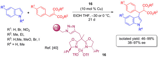 Beletskaya et al. [40] studied asymmetric Friedel–Crafts alkylation of indole and its derivatives in the presence of complex of Cu(OTf)2 with chiral isopropyl bis(oxazoline) ligand immobilized on Merrifield resin™ according to the “click” procedure 16. The target products were obtained with a yield of up to 99% and up to 97% ee. Catalyst 16 ensured high yield and enantioselectivity even after five-fold reuse (Scheme 9) [40].