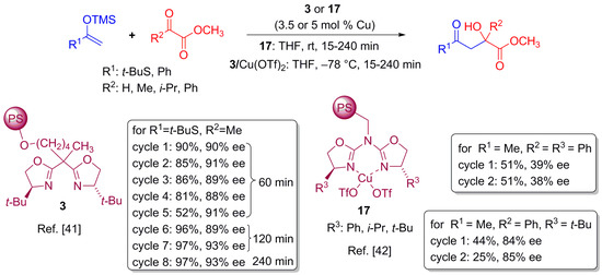 The highly-crosslinked polymer 3 was prepared by a copolymerization strategy in the presence of toluene as a porogen agent [41]. The heterogeneous catalyst 3/Cu(OTf)2 was less active than the analogous homogeneous catalysts, and aldol products were formed after a longer time; however, high overall yield (90%) and with an enantiomeric excess comparable to those obtained with the soluble ligands (90% ee), was obtained. Moreover, the catalyst based on polymer complex 3 was easily recovered by simple filtration and was reused several times without any loss of activity or stereoselectivity (Scheme 10) [41]. In the second work, the azabis(oxazoline) complexes 17 bonded to Merrifield resin™ were confirmed for the aldol reaction of different α-ketoesters with silylated ketone enolates [42]. The catalysis results showed that these heterogeneous complexes 17 accomplished enantioselectivities only slightly lower than those obtained in solution. Catalyst recovery depends on the ligand, so whereas polymers (R3: Ph) and (R3: i-Pr) were recovered with the same unsatisfactory results (51%, 38–39% ee), the recovered catalyst coming from (R3: t-Bu) led to even slightly lower yields (25%) but with the higher enantioselectivity (85% ee) (Scheme 10) [42].