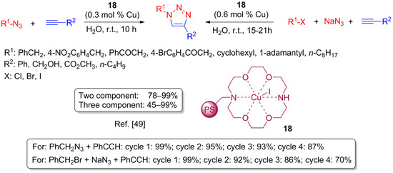 Huisgen 1,3-dipolar cycloaddition catalysed by polystyrene supported complex 18.