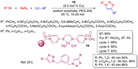 The recovery and reuse of catalyst 19 was successfully confirmed with the same three-component reaction (Cycle 1: 99%; Cycle 4: 95%; Cycle 7: 93%) (Scheme 12). This catalytic system also showed excellent activity for the synthesis of bis-1,4-disubstituted 1,2,3-triazoles (66–88%) [51].