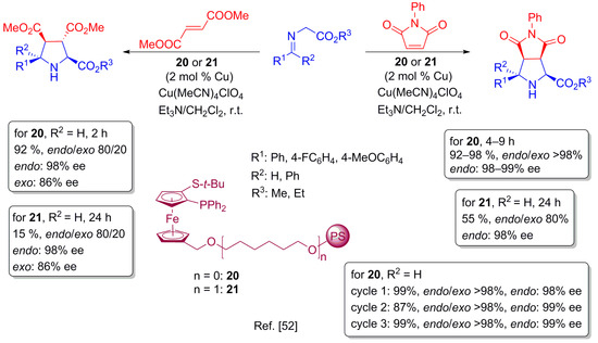Carretero et al. [52] studied the Cu(I)-catalysed asymmetric 1,3-dipolar cycloaddition of azomethine ylides generated from substituted arylimines derived from glycine esters with N-phenylmaleimide or dimethyl fumarate (Scheme 13). Except for the homogeneous variant, cycloaddition was studied in the heterogeneous system with the use of in situ prepared complexes Cu(MeCN)4ClO4 with Fesulfos-based chiral ligands immobilized on Merrifield′s peptide resin (1% cross-linked, 200–400 mesh, 2 mmol Cl/g) 20 or on trichloroacetimidate Wang resin (copoly(styrene-1% DVB), 200–400 mesh, 0.6–1.00 mmol trichloroacetimidate/g resin) 21.