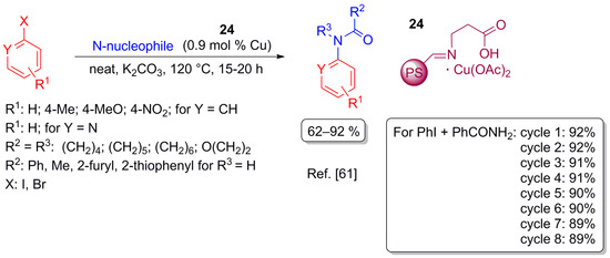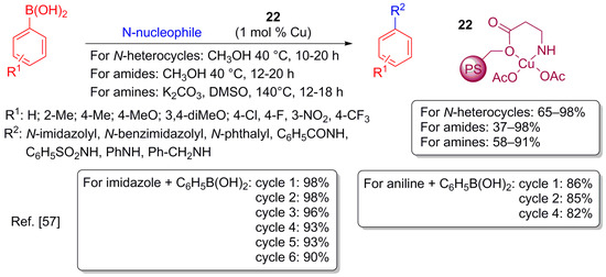 The recovery and reuse of catalyst 22 was studied for the reaction of phenylboronic acid with imidazole (Cycle 1: 98%; Cycle 6: 90%) and aniline (Cycle 1: 86%; Cycle 4: 82%). In both cases, only a slight decrease in yields was observed (Scheme 14) [57]. Under comparable conditions as in [57] (catalyst 22), the same authors achieved analogical N-arylations of N(H)-heterocycles with aryl halogenides and arylboronic acids with good or excellent results with the use of heterogeneous catalysts based on complexes of polystyrene–Schiff bases (PS-4-C6H4N=CH-2-pyridyl Cu(OAc)2) [58], or (PS-4-C6H4N=CH-2-furyl Cu(OAc)2) [59].