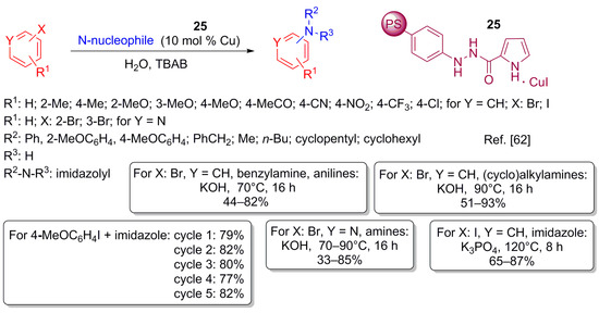 Catalyst 24 was prepared from commercial chloromethylated polystyrene, where the chloromethyl group was transformed to an aldehydic group. Subsequent reaction with β-alanine led to the production of an imine, which was then coordinated with Cu(II) acetate. N-arylations were performed without a solvent and in the presence of K2CO3 at 120 °C, for 15–20 h, with yields in the range of 62–92%. The recovery and reusing of catalyst 24 was successfully tested for the reaction of benzamide with iodobenzene (Cycle 1: 92%; Cycle 8: 89%) (Scheme 16) [61]. Further examples of reactions proceeding in aqueous media were N-arylation of substituted bromobenzenes with substituted anilines and (cyclo)alkylamines, catalysed by catalyst 25 in the presence of tetrabutylammonium bromide (TBAB) (Scheme 17) [62]. Catalyst 25 was prepared by the sequence of reactions from atactic polystyrene. Firstly, polystyrene was nitrated, reduced to amine, diazotated, and reduced to hydrazine, which was then acylated by 1H-pyrrole-2-carboxylic acid. The catalyst 25 itself was generated directly in the reaction mixture from the functionalized polystyrene and Cu(I) iodide.