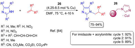 Nucleophilic addition of N-nucleophiles on activated multiple bonds (aza-Michael addition) is a significant reaction in the synthesis of β-amino carbonyl compounds as crucial intermediates in the synthesis of β-amino acids, β-lactam antibiotics, and chiral auxiliaries [63]. Simple, green and efficient preparation of N-alkylated imidazoles was tested, with a reaction of substituted imidazoles with different α,β-unsaturated compounds catalysed by polystyrene-supported CuI–imidazole complex catalyst 26 (Scheme 18) [64]. Catalyst 26 was prepared via surfactant free emulsion polymerization with 4-VBC (4-vinylbenzylchloride) and DVB (2%), whereby uniform globular particles (400–500 nm) with high Cl content (21.5%) were obtained initially. Afterwards, these particles were highly functionalized by imidazole and coordinated by CuI.