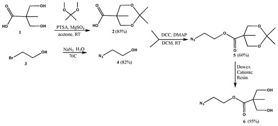The synthesis of dendrimers was carried out using a careful design of building blocks with compatible functionalities. Since we intended to employ click chemistry both in the synthesis and functionalization of our dendrimers, we selected two building units, one with an acetylene moiety and another with an azide. The azide functionalized 2,2-bis(hydroxymethyl)propanoic acid (bis-MPA, Scheme 1) was prepared from bis-MPA (1) and bromoethanol (3). The diol terminal of the bis-MPA unit was first protected with an acetonide group, to yield 2, which could be purified easily by neutralizing with p-toluenesulfonic acid, followed by filtration.