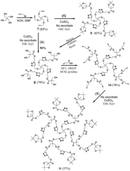 Bromoethanol (3) was reacted with sodium azide to yield 4, which was then coupled with 2 using N,N′-dicyclohexylcarbodiimide (DCC)/4-dimethylaminopyridine (DMAP), to yield 5, a bifunctional molecule with a protected diol at one end and an azide at the other. It was deprotected to yield 6, with azide and diol terminals. Propargyl bromide was coupled to the pentaerythritol core, yielding the tetra-acetylene terminated G0 dendrimer 7 (Scheme 2). The azide functionalized bis-MPA 6 was then clicked to G0 using CuAAC reaction to yield G1 dendrimer 8 with eight terminal hydroxide groups. It can also be prepared by first reacting core 7 with protected version of the azide functionalized bis-MPA 5 using CuAAC reaction to give 9, followed by deprotection. This method gave better yields than the first route.