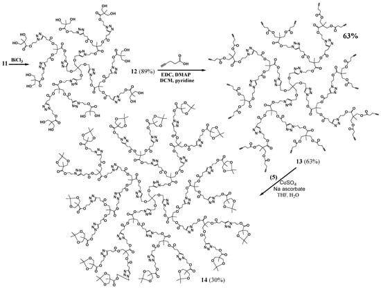 - Vieyres, A.; Lam, T.; Gillet, R.; Franc, G.; Castonguay, A.; Kakkar, A. Combined Cu(I)-catalysed alkyne-azide cycloaddition and furan-maleimide Diels-Alder “click” chemistry approach to thermoresponsive dendrimers. Chem. Commun. 2010, 46, 1875–1877. [Google Scholar] [CrossRef] [PubMed]