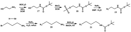 Dendrimers with positively charged amine groups on the surface were synthesized from the acetylene terminated dendrimers, by reacting them with protected amino-azides. The latter were synthesized from the commercially available amino alcohol. The amine was first protected with a t-butoxycarbonyl (BOC) group to yield 17 (Scheme 5), which was purified by washing in sequence with a basic followed by an acidic solution, brine and finally water. The alcohol group of 17 was then converted to a mesylate upon reaction with methane sulfonyl chloride to yield 18, which was subsequently azidified to afford 19. The amino-azide with a longer arm was prepared from commercially available amino-bromide by reacting it with sodium azide to yield 20, which was purified by a basic work-up, followed by extraction (Scheme 5). The amine moiety of 20 was then protected with tBOC to yield 21.