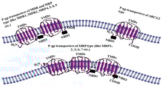 Later on, it was understood that MDR1/P-gp alone cannot be responsible for every type of MDR and this eventually led to the discovery of other related transporters, especially breast cancer–resistance protein (BCRP, also known as ABCG2) and MDR-associated protein (MRP1 also known as ABCC1). Amino acid sequence analysis indicated that all these MRPs comprise multiple transmembrane domains (TMDs) and intracellularly confined ATP binding cassettes (ABCs) or nucleotide binding domains (NBDs) (Figure 1).