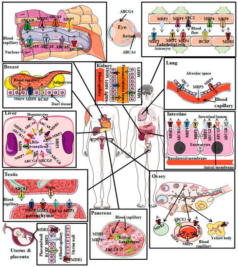 The human MDR1 is ubiquitously expressed and is perhaps one of the most significant ABC transporters for drug disposal in humans and thus carries pharmacological importance. It has been identified as a primary cause of MDR. Functionally, the P-gp efflux transporter protects our body against orally ingested or airborne toxins, xenobiotics or drugs by excreting them into bile, urine and intestinal lumen thus inhibiting their impact in brain, testis and placenta. It is substantially involved in many drug interactions and thus carries some pharmacokinetic importance as well. Thus, in the subsequent sections we have summarized MDR1/P-gp tissue distribution, structure, its mechanism of action, pathophysiological and pharmacokinetic roles in MDR.