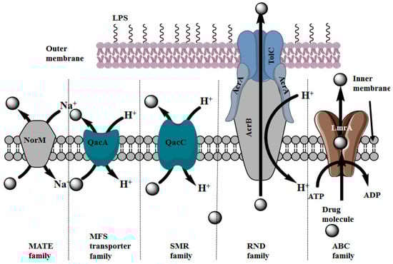 Schematic diagram representing different types of drug transporters present in microorganisms [27,28,29,30,31,32,33].