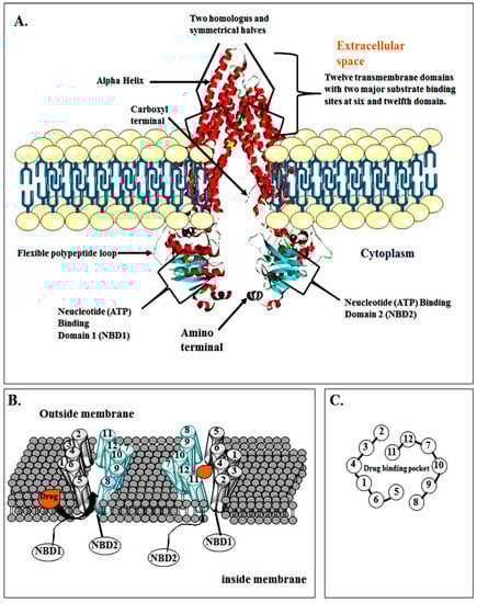 Schematic diagrams representing: (A) Structure of drug transporting P-gp; (B) drug binding pocket of P-gp; (C) drug binding pocket of P-gp surrounded by TMs [2,35,36,37,38,39,40,41,42].