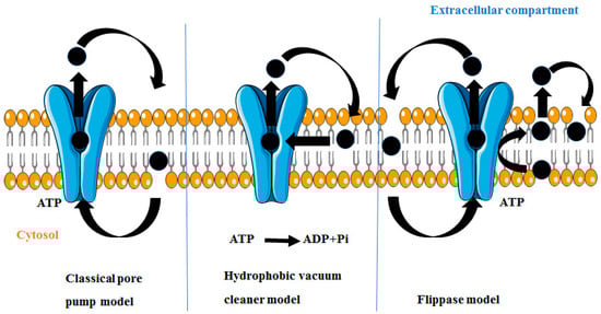 Drugs or substrates can move through the cell membrane by filtration, simple diffusion, or by specialized transport, and the preliminary stage in the drug efflux is the identification of the drug by P-gp succeeded by ATP binding and its hydrolysis. Finally, the energy produced is used to efflux substrate out of the cell membrane by a central aperture. Until now, three models of P-gp-mediated drug efflux prevail, namely the “classical pore pump model,” “hydrophobic vacuum cleaner (HVC) model” and “flippase model” as shown in Figure 5.