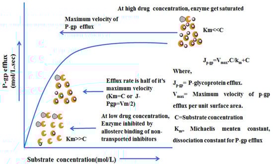 P-gp mediated efflux action follows an active transport mechanism process. In this process, ATP hydrolysis provides the driving force for extrusion of xenobiotics. Generally, the efflux occurs unidirectionally where the xenobiotic is thrown from within the cell into the outer extracellular space and transports only one molecule at a time. Thus, P-gp is also regarded as a uniporter carrier protein. When substrates try to bind with the protein transport site of P-gp for translocation, a competitive inhibitor arrives to vie with the substrate drug for discharge and occupy all the accessible protein transport sites leaving no opportunity for the P-gp and substrate interaction whereas on the other side non-competitive inhibitors neither bind to the transport sites nor are translocated by the efflux pumps and therefore are as well-known as non-transported inhibitors. They rather bind to an all osteric modulatory site and non-competitively inhibit the protein efflux. The mechanism of action of the competitive and non-competitive (non-transported) inhibitors apart from the P-gp efflux kinetics is depicted in Figure 6, as non-linear dose dependent kinetics, mixed-order kinetics or Michaelis-Menten kinetics [49].