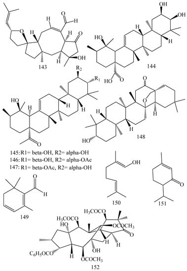 Terpenoids are derived from C5H8 isoprene units joined in a head to tail manner. They are classified as monoterpenoids (10 carbons), sesquiterpenoids (15 carbons), diterpenoids (20 carbons), and triterpenoids (30 carbons) [247]. Terpenoids have been reported to possess significant P-gp inhibitory activity via several mechanisms. Citral, a monoterpenoid, directly inhibits MRP1 and MRP2 via binding to their active sites in isolated Sf9-MRP1- and Sf9-MRP2-membrane vesicles [187]. Latilagascene B, latilagascene E and latilagascene D inhibit P-gp mediated MDR via directly blocking its active sites and thereby reverse doxorubicin resistance [190]. Paraliane, pepluanin A, jolkinol B, euphoportlandol A, euphoportlandol B, helioscopinolide A, helioscopinolide B, helioscopinolide E, helioscopinolide F, tuckeyanols A, tuckeyanols B and euphotuckeyanol are some of terpenoids, which inhibit P-gp activity via binding with its active sites [191,192,193]. Isopimaric acid inhibits microbial TetK or NorA efflux pumps and potentiates antibiotic activity in Staphylococcus aureus [202]. Totarol has been reported to inhibit NorA efflux pump and thereby enhances the effectiveness of antibiotics against Staphylococcus aureus [203].