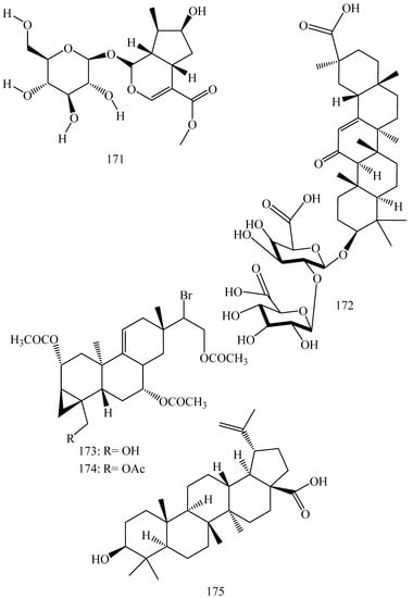 - Rojas, R.; Caviedes, L.; Aponte, J.C.; Vaisberg, A.J.; Lewis, W.H.; Lamas, G.; Sarasara, C.; Gilman, R.H.; Hammond, G.B. Aegicerin, the first oleanane triterpene with wide-ranging antimycobacterial activity, isolated from Clavija procera. J. Nat. Prod. 2006, 69, 845–846. [Google Scholar] [CrossRef] [PubMed]
