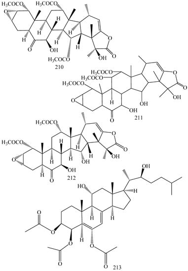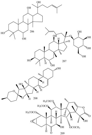 Saponins are classified as steroidal and triterpenoidal. Sapogenins are free aglycones of saponins, which may be steroids, sterols, and triterpenoids. These exibit P-gp reversal activities via different mechanisms. Astragaloside II is reported to down-regulates the expression of the P-gp and MDR1 genes and thereby participates in 5-fluorouracil-resistance in human hepatic cancer cells, Bel-7402/FU [207]. Gracillin is known to inhibit P-gp mediated daunorubicin efflux in K567/R7 cells via direct interaction with active binding sites [208]. Tenacissimoside A has been reported to reverses MDR in P-gp overexpressing cancer cells (HepG2/Dox cells) toward doxorubicin, vinblastine, puromycin and paclitaxel via direct interaction with P-gp substrate site [210]. Karavilagenin C inhibits Rv1258c efflux pump and thereby augments antimicrobial activity of ethidium bromide to Enterococcus faecalis [211,212]. Balsaminol and balsaminagenin inhibits AcrAB-TolC efflux pump and potentiate actimicrobial activity in Staphylococcus aureus and Escherichia coli [211,212]. Pinnatasterone shows inhibition of P-gp-mediated daunorubicin efflux in K562/R7 cells via direct interaction with active binding sites [195]. Ginsenoside F1 inhibits P-gp ATPase activity and exhibits P-gp inhibitory activity on MDR1-MDCKII and Caco-2 cells [196]. Agosterol A inhibits ATP-dependent drug efflux by P-gp and MRP1 resulting reversal of colchicine resistance in KB-C2 cells [7]. Protopanaxatriol directly inhibits P-gp mediated substrate transport. Ginsenoside F1 inhibits P-gp ATPase activity and thereby inhibits P-gp in daunorubicin- and doxorubicin-resistant acute myelogenous leukemia sublines (AML-2/D100 and AML-2/DX100) [213]. 20(S)-Ginsenoside F1 inhibits P-gp ATPase activity and shows P-gp inhibitory activity on MDR1-MDCKII and Caco-2 cells [196].