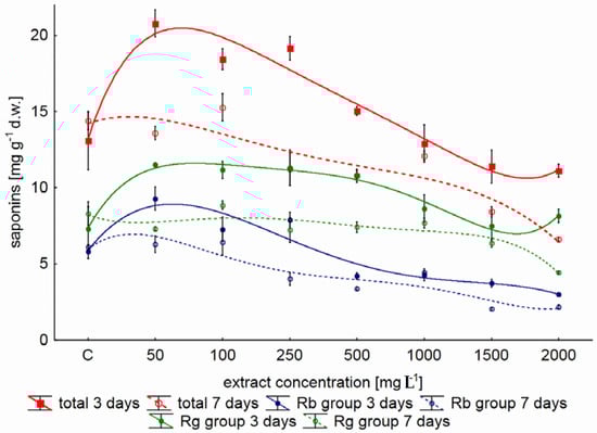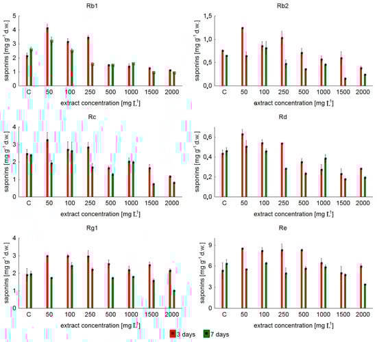 Another results were obtained for protopanaxadiol derivatives. The trend of changes in the content of saponins Rb group was similar to the changes observed for the total of six examined compounds. The level of protopanaxadiol derivatives was the highest in the medium containing 50 mg L−1 yeast extract. The obtained results showed that an inverse correlation was observed for the remaining concentrations of YE: when the amount of yeast extract in the medium increased, protopanaxadiol derivative content gradually reduced by half of their quantities (2.98 mg g−1 d.w. for 2000 mg L−1 YE) compared to untreated attempts (5.80 mg g−1 d.w.). Additionally, the results shown in Figure 1 also indicated that shorter time of elicitation was favorable for the accumulation of protopanaxadiol and protopanaxatriol derivatives.