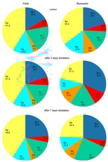 The percentage of individual ginsenosides in relation to all studied metabolites was also established in hairy roots growing in the shake flasks and the nutrient sprinkle bioreactor. As Figure 5 demonstrates, the profiles of ginsenosides in untreated root cultures from the shake flasks and the bioreactor were different. The higher percentage of Rb1 and Rd and lower Re percentage were noticed in root cultures growing in the scale up. Comparing the profiles of individual saponins in bioreactor and shake flask cultures after a short elicitation, the increase of proportion of all protopanaxadiol derivatives and the reduction of the share of protopanaxartiol derivatives were found.