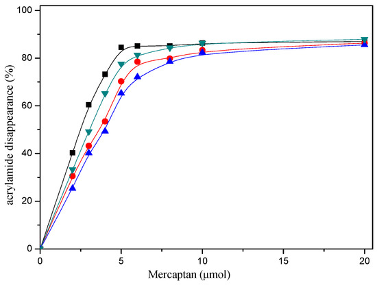 2.3. Acrylamide Consumption Produced to Mercaptan-Acrylamide Adducts