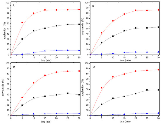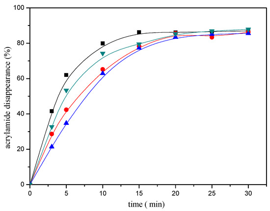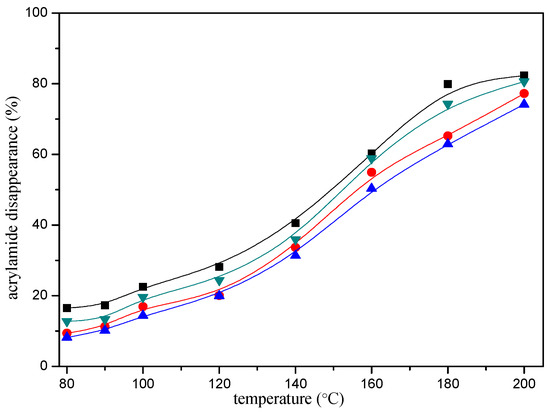 In addition, the disappearance of the acrylamide depended on the reaction conditions. The heating time and temperature had a significant impact on the disappearance of the acrylamide. As shown in Figure 2, acrylamide disappearance increased rapidly and almost linearly as a function of time during the first ten minutes of the reaction. The disappearance of the acrylamide in the reaction mixture reached an apparent maximum after 20 min of heating at 180 °C, then tended to balance afterwards. The effect of the temperature as shown in Figure 3, acrylamide disappeared faster with the temperature increasing.