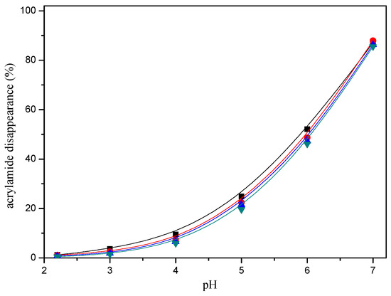 Acrylamide disappearance also depended on the pH. Acrylamide disappearance increased slowly as the pH increased from pH 2.2 to 4, while this disappearance was faster when a higher pH was assayed from pH 5 to 7 in a model system (Figure 4).