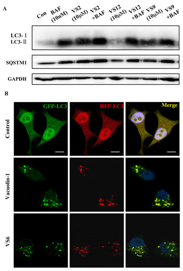 Vacuolin-1 analogues identified via virtual screening inhibited autophagic flux in HeLa cells. (A) Treatment of HeLa cells with vacuolin-1 analogues (10 µM) and BAF (100 nM) failed to further increase the accumulation of both LC3B-II and SQSTM1 as compared to either drug alone. (B) Vacuolin-1 (10 µM) or VS6 (10 µM) induced the accumulation of yellow LC3B-II puncta in RFP-GFP-LC3B expressing HeLa cells. Scale bar = 10 µm.