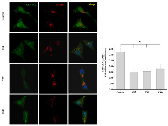 Vacuolin-1 analogues (10 µM) markedly induced GFP-LC3B-II puncta in HeLa cells, which were not colocalized with RFP-LAMP1. Scale bar = 10 µm. *, paired t-test, p < 0.05 compared to control group.