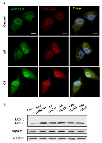 Subsequently, we again analyzed the effects of these 17 vacuolin-1 analogues on autophagy in tfLC3B-expressing HeLa cells by both western blot and confocal image analyses. As shown in Figure 4, S3, and Table 2, analogues B3, B4, B5, and C5 failed to induce the accumulation of both LC3B-II and SQSTM1 at all doses, analogues B1, C2, and C6 only weakly induced the accumulation of LC3B-II and SQSTM1, analogues A1, A2, A3, A6, C1, and C3 showed good potency, and analogues A4 and A5 were as potent as vacoulin-1. Similarly, the positive analogues, e.g., A5 and others, markedly induced the yellow LC3B-II puncta in HeLa cells (Figure 5A and Figure S4), and co-treatment of cells with these analogues and bafilomycin (BAF) failed to further induce the accumulation of LC3B-II and SQSTM1 as compared to either drug alone (Figure 5B). Therefore, these data indicate that the synthesized vacuolin-1 analogues are autophagy inhibitors with good potency comparable to vacuolin-1.