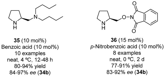 The Michael addition of α,α-disubstituted aldehydes to nitroalkenes provides adducts possessing all-carbon quaternary centers. Isobutyraldehyde is an adequate aldehyde for this organocatalytic asymmetric reaction (Scheme 9), which justifies its frequent use as a model when a new organocatalyst is developed. Some examples of chiral pyrrolidine-containing catalysts are diamine 35 [54] and pyrrolidine-oxyimide 36 [55], which led to enantiomer 34b (R = aryl) under solvent-free conditions and in the presence of a carboxylic acid as co-catalyst (Figure 5). The same enantiomer was mainly obtained using the pyrrolidine-HOBt 26 as organocatalyst (20 mol %), in water as solvent at 0 °C and in the presence of benzoic acid as additive (10 mol %) (73–91% yield, 77–93% ee) [50]. This three organocatalysts have also been employed using cyclopentanecarbaldehyde as a pro-nucleophile affording the compound similar to 34b [(CH2)4 instead of 2Me] (using 35: 76–93% yield, 92–96% ee; using 36: 80–91% yield, 78–92% ee; using 26: 69–91% yield, 74–92% ee).