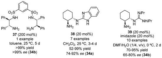 C2-Symmetric diamines have been employed profusely as chiral blocks in the preparation of organocatalysts for asymmetric reactions [56]. An example is the use of wedge shaped 1,3-benzenedisulfonamide 37 (Figure 6), obtained from (1R,2R)-1,2-diphenylethane-1,2-diamine, in the Michael addition of isobutyraldehyde to β-nitrostyrene leading to 34b (R = Ph) [57]. This compound 37 mimics the chiral pocket of an enzyme, embedding the nitro group in the groove of the catalyst by means of double hydrogen bonding, whereas the enamine from the aldehyde is formed with one of the primary amino groups. However, chiral trans-cyclohexa-1,2-diamines have been the C2-symmetric diamines which have been more frequently used when designing new chiral organocatalysts. An example is the primary amine-containing benzimidazole 38 (Figure 6), which acts bifunctionally by hydrogen-bond coordination with one of the hydrogens of the nitro group of the nitroalkene, while the last reacts with the primary amine-formed enamine [58]. Another example is the guanidine-containing primary amine 39 (Figure 6), which has been used for the asymmetric conjugate addition of isobutyraldehyde to nitrostyrenes to give preferentially 34b (R = aryl), working in an aqueous medium [59]. In this case the catalyst cannot be considered as bifunctional, as it has been determined by theoretical calculations that, probably due to the presence of water, the guanidine function is not coordinated to the nitro group in the transition state.