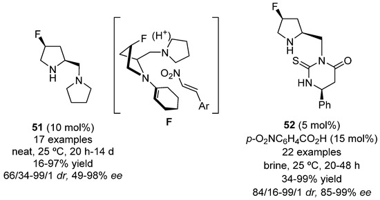 In order to study the effect of the conformation of the pyrrolidine ring on the outcome of the reaction, a fluorine atom was added at the 4-position of the pyrrolidine ring in catalyst 51 (Figure 9). The gauche effect cause by the fluorine atom led to a drastic improvement in the formation of products of type 46, under solvent free conditions. It was observed that the addition of 10 mol% of trifluoroacetic acid provided better stereoselectivities when electron deficient substituted β-nitrostyrenes were used as electrophiles, while the contrary occurred for their electron-rich substituted counterparts. Furthermore, the catalyst was quite efficient in promoting the reaction of other cyclic ketones and acetone with nitrostyrenes [79]. As shown in the proposed stereochemical model F (Figure 9) created by reaction with cyclohexanone, when a fluorine atom was introduced at the 4-position of the pyrrolidine ring, the (E)-trans-Cγ-endo is the favored conformation due to the gauche effect.
