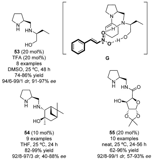 Another way of trying to improve the results of the pyrrolidine-based catalyst in the Michael reaction of ketones to nitroolefins was to introduce an additional stereogenic center in the side chain, as well as a new hydrogen-bonding functionality. Thus, chiral 1,2-amino alcohols have been incorporated to the pyrrolidine moiety producing bifunctional organocatalysts such as compound 53 (Figure 10). This catalyst, in the presence of trifluoroacetic acid, gave good results in the reaction between cyclohexanone and β-nitrostyrene derivatives. DFT calculations showed that both NH and OH groups activated the nitro moiety by the formation of hydrogen bonds, as illustrated in the coordination model G, favoring its approach from the Re-face of the anti-enamine [81].