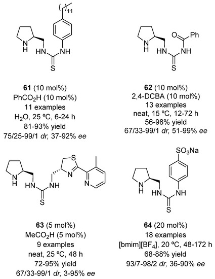 Privileged type of organocatalysts used in this Michael addition are those containing a thiourea moiety. Examples of the combination of the pyrrolidine ring together with the thiourea group are shown in Figure 13. Thus, the surfactant-type thiourea 61 worked smoothly in water as solvent, giving adducts of type 46 in good results. When the same reaction conditions were applied to cyclopentanone or acetone, the achieved enantioselections were lower [89]. A similar trend was observed when catalyst 62 was used in the presence of 2,4-dichlorobenzoic acid (2,4-DCBA) for the Michael addition of ketones to β-nitroolefins under neat conditions. Although high enantioselectivities were achieved in the reaction of cyclohexanone with aromatic and, even, aliphatic nitroolefins, results were not satisfactory when those conditions were applied to cyclopentanone or acetone [90]. The same catalyst 62 was also able to promote the addition of cyclohexanone to β-nitrostyrenes in water, but in the presence of 2-nitrobenzoic acid (10 mol %), which enhanced the obtained yields [91]. Poor results were also obtained when acetone was used as pro-nucleophile with trans-nitrostyrene using thiazoline-thiourea-pyrrolidine catalyst 63 under neat conditions. However, these reaction conditions allowed the preparation of adducts 46 in good results [92]. The ionic liquid-soluble pyrrolidine-urea 64 promoted the Michael addition of cyclohexanone or acetone to several aryl and heteroaryl β-nitroolefins. Although the yields were constantly high for both ketones, the enantioselectivities were lower for adducts arising from acetone. This catalytic system could be reused four times with comparable results [93].