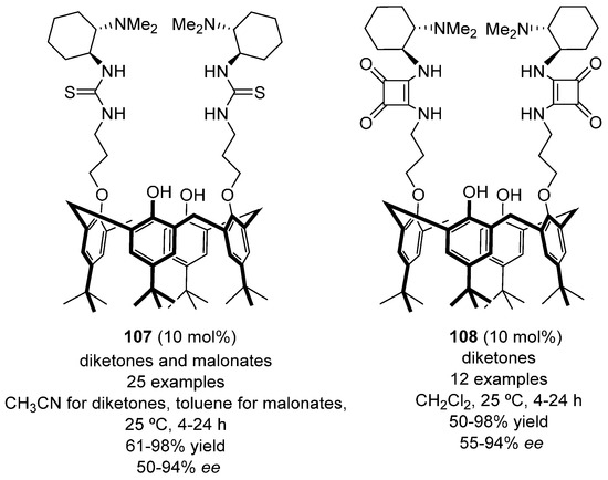 - Durmaz, M.; Tataroglu, A.; Yilmaz, H.; Sirit, A. Calixarene-derived chiral tertiary amine-thiourea organocatalyzed asymmetric Michael additions of acetyl acetone and dimethyl malonate to nitroolefins. Tetrahedron Asymmetry 2016, 27, 148–156. [Google Scholar] [CrossRef]
