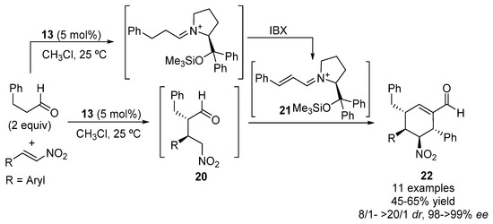In addition, this organocatalyst 13 has been applied to the preparation of the core structure of Cephalotaxus norditerpenes, with interesting antineoplastic and antiviral properties. Thus, phenol moiety-containing aldehydes 17 were asymmetrically added to β-arylated trans-nitroalkenes in the presence of the organocatalyst 13 and 4-nitrophenol as acid additive to give the corresponding nitroaldehydes, which were reduced in situ affording nitroalcohols 18. Subsequent oxidative dearomatization gave cis-disubstituted dihydroazulenones 19 (Scheme 5) [41]. This organocatalyst 13 has also been used in an asymmetric cascade reaction leading to polyfunctionalized cyclohexene aldehyde derivatives in the presence of an oxidant such as o-iodoxybenzoic acid (IBX) [42]. Thus, Michael addition reaction of dihydrocinnamaldehyde (2 equiv.) with nitroalkenes led to intermediate nitroaldehydes 20 (Scheme 6). Simultaneously, the initial imine is oxidized in the presence of IBX to a conjugated iminium ion 21 which reacts as a Michael acceptor with the former adduct 20 to yield a cyclized product 22 through aldol condensation and hydrolysis. In addition, the same organocatalysts, in the presence of p-nitrophenol as co-catalyst, has been employed in the asymmetric reaction of succinaldehyde with 3-bromo-2-fluoronitrostyrene, to give a key intermediate in the total synthesis of the prostaglandin-analog beraprost [43]. Moreover, γ-nitroaldehydes type 2 have been prepared organocatalytically by means of 13, and have been used for the synthesis of enantioenriched five-membered cyclic nitrones after reductive cyclization [44].