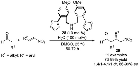 As previously shown, syn-nitroaldehydes of the type 2 are the main adducts obtained in the conjugate addition of aldehydes to trans-β-nitroalkenes. However, a less common anti-selectivity can be prevalent if some specific chiral amines are used as organocatalysts. Thus, the biphenyl-based chiral secondary amine 28 organocatalyze the Michael addition of aldehydes to nitrostyrenes, leading mainly to the less accessible anti-adducts 29 (Scheme 7) [52].