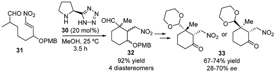 The asymmetric synthesis of the A-ring fragment of C19-diterpenoid atropurpuran has been achieved after a key step consisting of an intramolecular Michael addition reaction using 5-pyrrolidinyl tetrazole 30 as organocatalyst (Scheme 8). In this way, nitroalkene 31 afforded four diastereomeric cyclohexanes 32 which were converted into two substituted cyclohexanones 33, with different enantioselectivities according to the starting diastereomer [53].