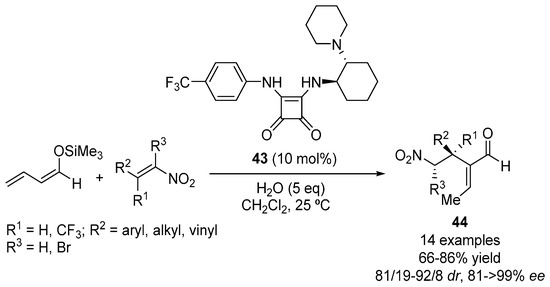 Thus, the use of calyx[4]arene-based chiral bifunctional primary-amine thiourea 40 has led to the adduct 34a (R = aryl) [64], whereas the use of rosin-based primary-amine thiourea 41 drove to 34b (R = aryl) in high yields and enantioselectivities [65]. This last organocatalyst 41 has also been used in the addition of other differently α,α-disubstituted aldehydes to β-nitro-4-nitrostyrene, achieving highs ee’s (up to 99%) of the final nitroaldehyde, although with moderate diastereo selectivities (up to 83/17). Kinetic and spectroscopic studies of the conjugate addition of 2-phenylpropanal to nitroolefins catalyzed by two different primary amine thiourea catalysts have shown that, at least in these cases, the resting state is a product imine species that undergoes reversible hydrolysis to form the reaction product, and that reversibility of the reaction is implicated in cases of low enantio- and diastereoselectivity [66]. Amine-containing squaramides have shown as efficient bifunctional organocatalysts in many asymmetric processes as amine-containing thioureas [67,68]. A recent example is the use of isosteviol-containing primary amine-squaramide 42 as organocatalyst in the asymmetric conjugate addition of isobutyraldehyde to nitroalkenes, achieving adduct 34a (R = aryl, alkenyl) (Figure 7) [69]. It is interesting to note that similar values of the opposite final configuration 34b has been achieved exchanging the cyclohexa-1,2-diamine moiety of the catalyst by its corresponding enantiomer, showing that the isosteviol moiety is not involved in the enantioselectivity. Moreover, the regioselective functionalization of aldehyde-derived silyl−diene enol ethers under a bifunctional tertiary amine-containing squaramide organocatalyst 43 has shown to produce a change in the regioselectivity, from the 1,5- to the 1,3-functionalization, affording Rauhut-Currier-type conjugated aldehydes 44 after double bond isomerization, as exemplified in Scheme 10. This procedure has made possible the 1,3-addition of silyl−dienol ethers to nitroalkenes [70].