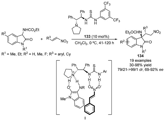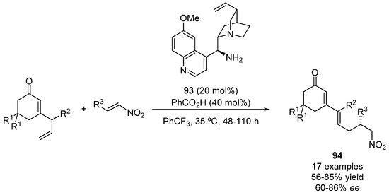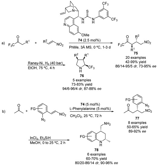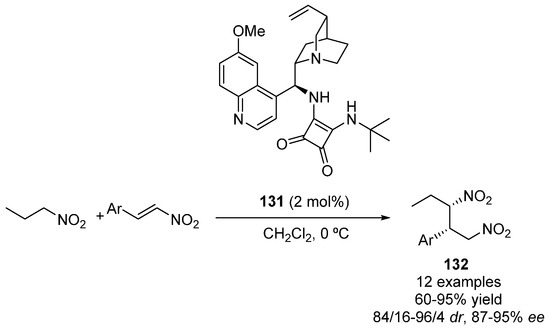 In the case of pro-nucleophiles bearing much more acidic α-hydrogens than those on aldehydes and ketones (i.e., in the methylene group of 1,3-dicarbonyl compounds), chiral tertiary amines are usually employed as organocatalysts. Their basic character allows to deprotonate the pro-nucleophile, leading to an enolate which coordinates with the protonated base. Similarly to aldehydes and ketones, if amine-containing bifunctional organocatalysts are employed, the nitro group of the nitroalkene can be also coordinated by means of hydrogen bonds with the acidic moiety of the catalyst, affording a tight transition state which lead to suitable enantioinductions.