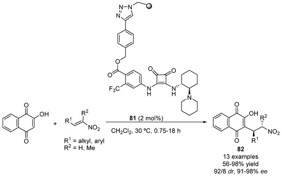 - Osorio-Planes, L.; Rodríguez-Escrich, C.; Pericàs, M.A. Removing the superfluous: A supported squaramide catalyst with a minimalistic linker applied to the enantioselective flow synthesis of pyranonaphthoquinones. Catal. Sci. Technol. 2016, 6, 4686–4689. [Google Scholar] [CrossRef]