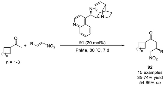 The thiourea-amino acid catalyst 69 has been used to perform the desymmetrization of prochiral 3-substituted cyclobutanones after Michael addition to trans-β-nitrostyrene derivatives, leading to products 68 with moderate enantioselectivities, and with one predominant isomer of the possible diastereoisomers (Scheme 14) [96].