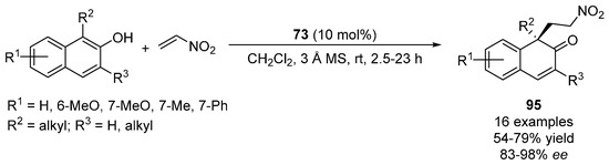 Several pyrrolidine-based catalysts containing a functional group in the side chain that provided an additional hydrogen-bond interaction have been developed and tested in this transformation. Thus, pyrrolidine derivative 47 (Figure 8) bearing a sulfoxide moiety was very effective in the addition of cyclohexanone, cyclopentanone and acetone to aromatic β-nitroolefins [75]. However, lower enantioselectivities (31–51% ee) were achieved when 2-butanone and 3-pentanone were used. Remarkably, the formation of the Michael adduct took place at the more substituted site when using 2-butanone.
