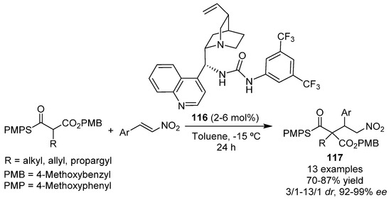 - Ansari, S.; Raabe, G.; Enders, D. Asymmetric Michael addition of 1,3-bis(phenylthio)propan-2-one to nitroalkenes employing Takemoto's thiourea catalyst. Monatsh. Chem. 2013, 144, 641–646. [Google Scholar] [CrossRef]