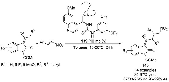 - Rassu, G.; Zambrano, V.; Pinna, L.; Curti, C.; Battistini, L.; Sartori, A.; Pelosi, G.; Zanardi, F.; Casiraghi, G. Direct regio-, diastereo-, and enantioselective vinylogous Michael addition of prochiral 3-alkylideneoxindoles to nitroolefins. Adv. Synth. Catal. 2013, 355, 1881–1886. [Google Scholar] [CrossRef]
