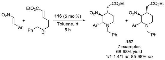 - Kriis, K.; Melnik, T.; Lips, K.; Juhanson, I.; Kaabel, S.; Jarving, I.; Kanger, T. Asymmetric synthesis of 2,3,4-trisubstituted piperidines. Synthesis 2017, 49, 604–614. [Google Scholar]