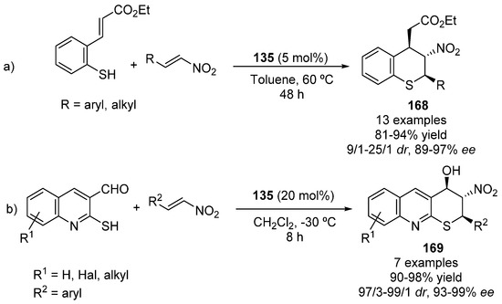 - Ping, X.-N.; Wei, P.-S.; Zhu, X.-Q.; Xie, J.-W. Catalyst-controlled switch in diastereoselectivities: Enantioselective construction of functionalized 3,4-dihydro-2H-thiopyrano[2,3-b]quinolines with three contiguous stereocenters. J. Org. Chem. 2017, 82, 2205–2210. [Google Scholar] [CrossRef] [PubMed]